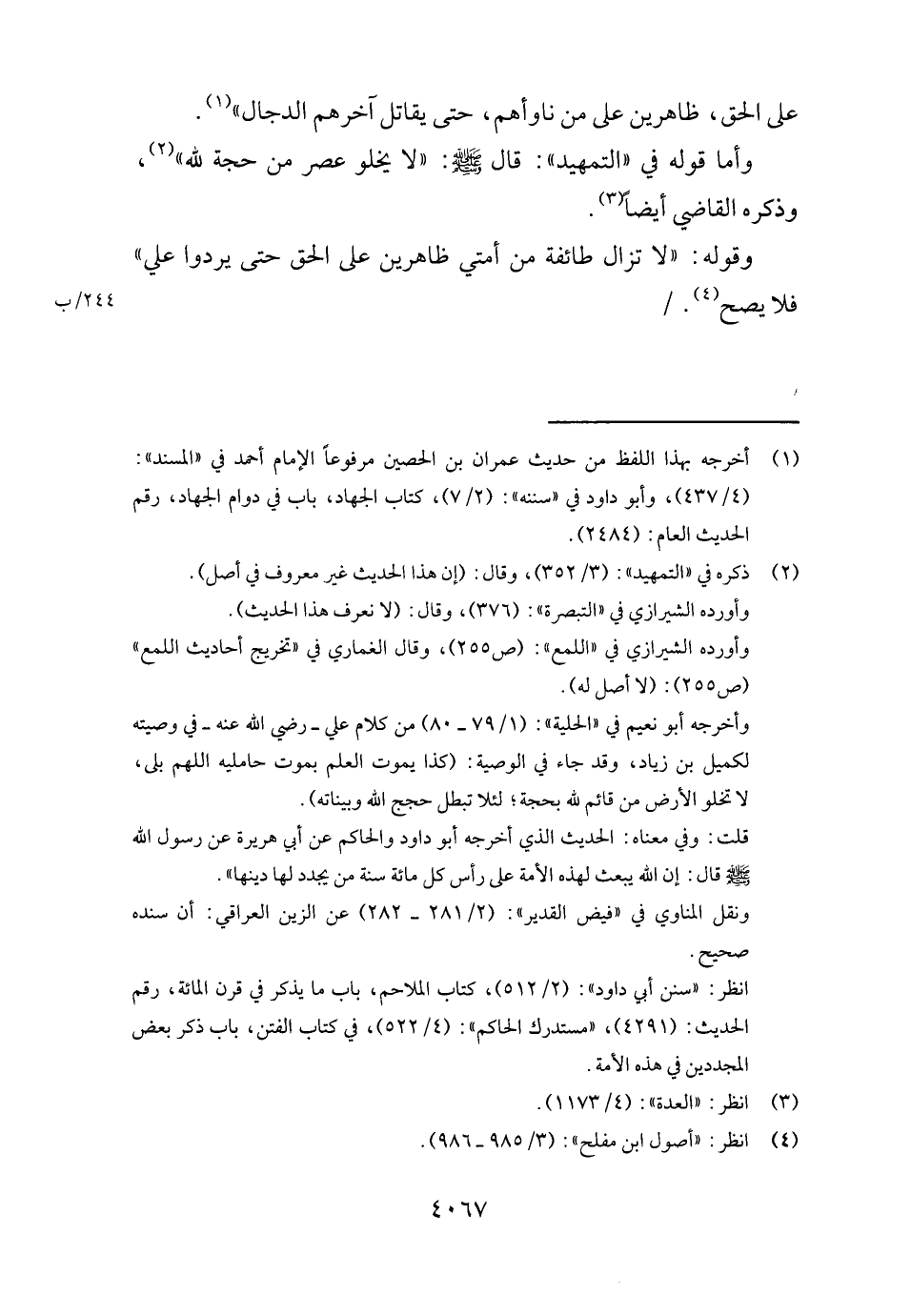 وَأما قَوْله فِي " التَّمْهِيد ": قَالَ - صَلَّى اللَّهُ عَلَيْهِ وَسَلَّم َ -: " لَا يَخْلُو عصر من حجَّة لله "، وَذكره القَاضِي أَيْضا.