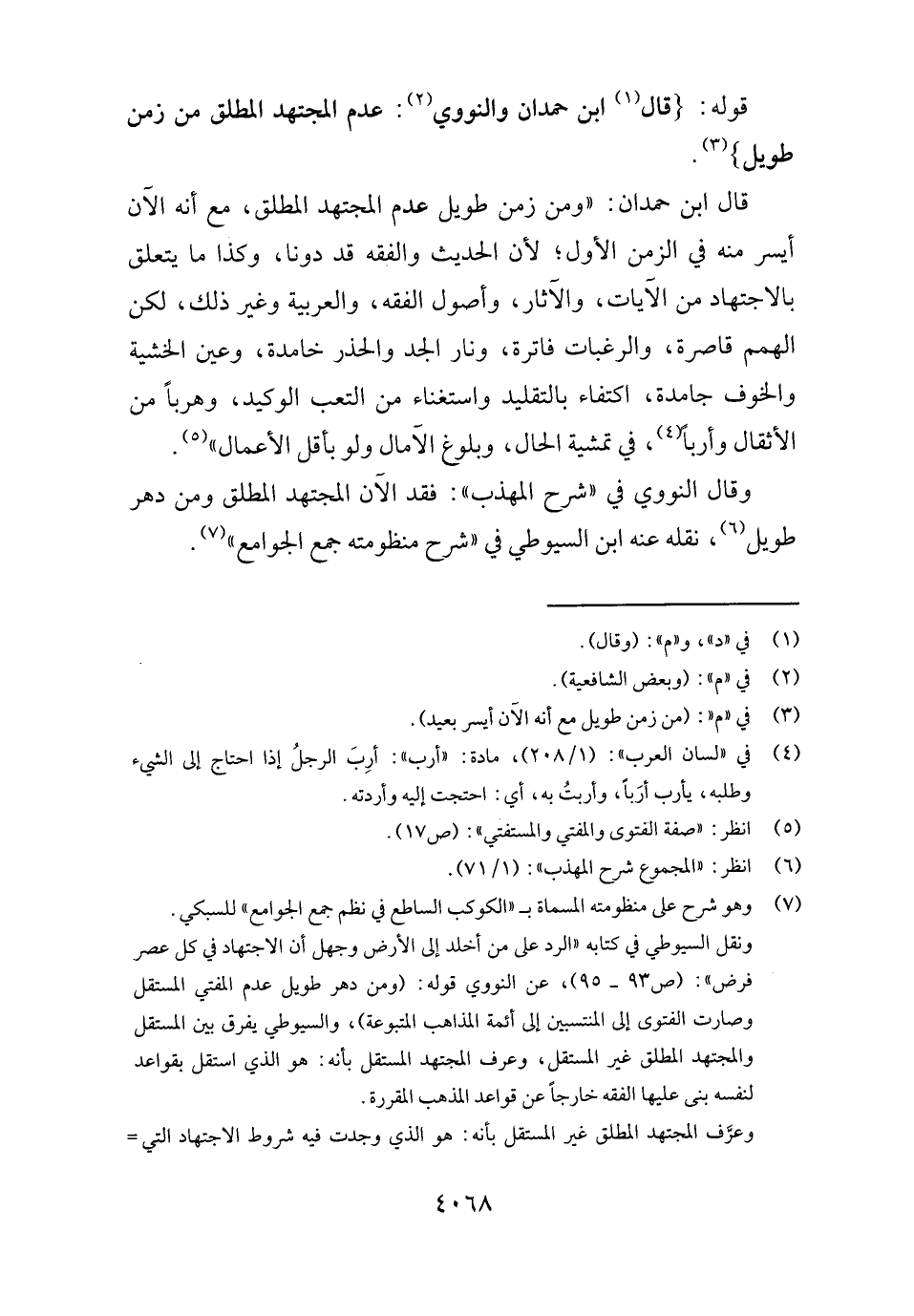 قَوْله: {قَالَ ابْن حمدَان وَالنَّوَوِيّ: عدم الْمُجْتَهد الْمُطلق من زمن طَوِيل} .