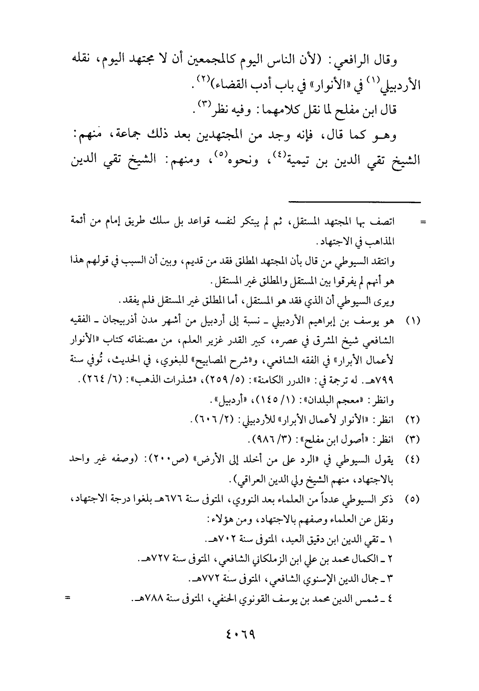 وَقَالَ الرَّافِعِيّ: (لِأَن النَّاس الْيَوْم كالمجمعين أَن لَا مُجْتَهد الْيَوْم، نَقله الأردبيلي فِي " الْأَنْوَار " فِي بَاب أدب الْقَضَاء) .