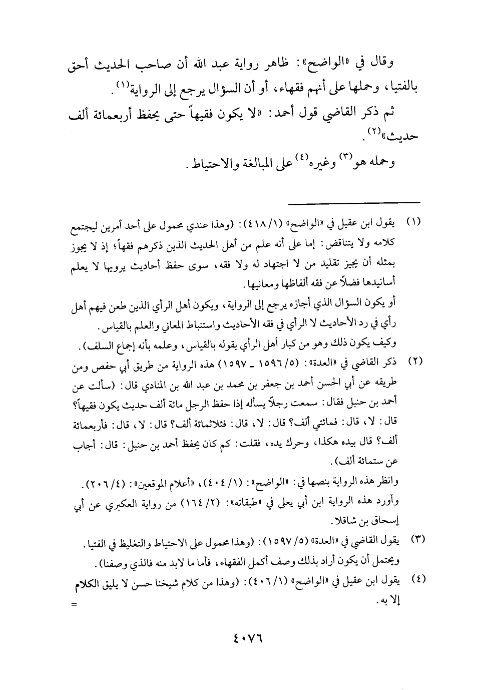 ثمَّ ذكر القَاضِي قَول أَحْمد: " لَا يكون فَقِيها حَتَّى يحفظ أَرْبَعمِائَة ألف حَدِيث ".