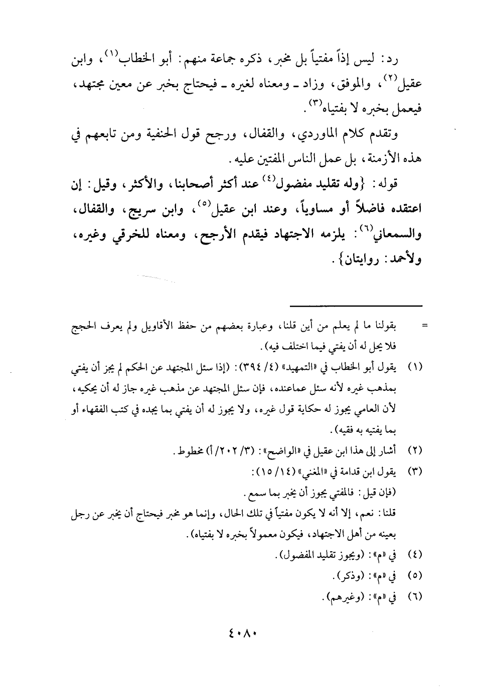 رد: لَيْسَ إِذا مفتيا بل مخبر، ذكره جمَاعَة مِنْهُم: أَبُو الْخطاب، وَابْن عقيل، والموفق، وَزَاد - وَمَعْنَاهُ لغيره - فَيحْتَاج بِخَبَر عَن معِين مُجْتَهد، فَيعْمل بِخَبَرِهِ لَا بفتياه.