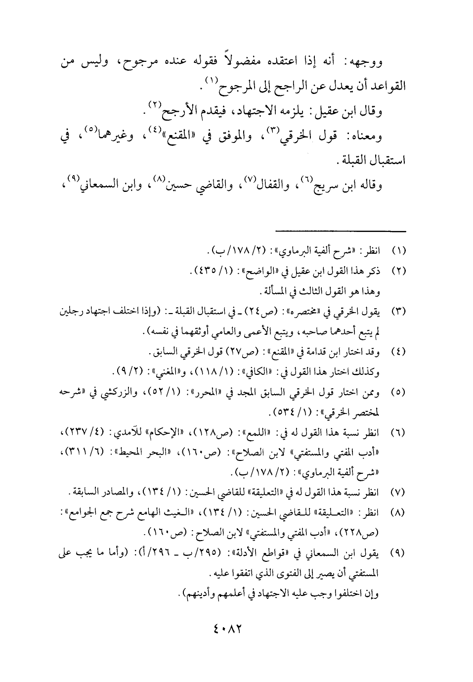 وَمَعْنَاهُ: قَول الْخرقِيّ، والموفق فِي " الْمقنع "، وَغَيرهمَا، فِي اسْتِقْبَال الْقبْلَة.