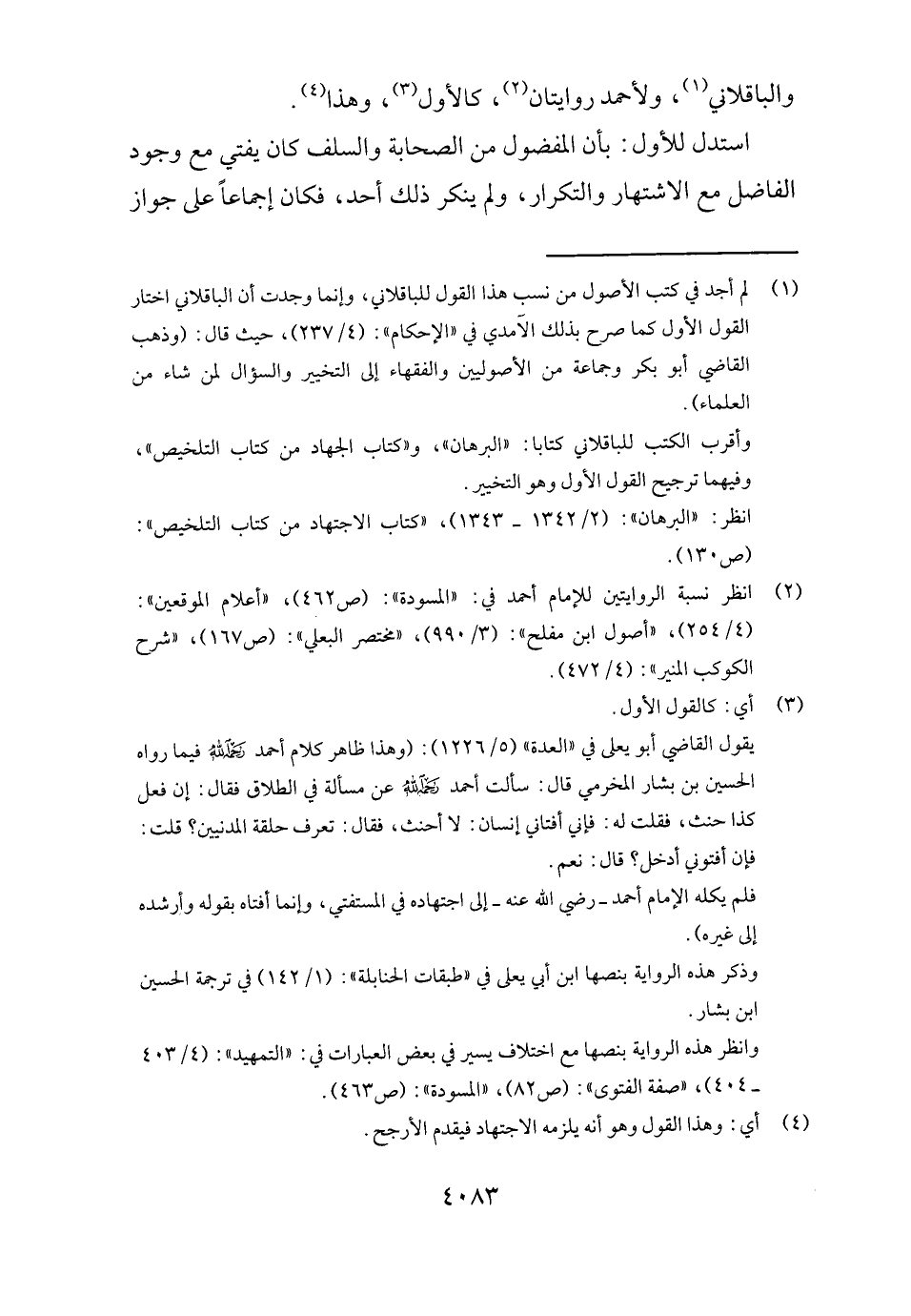 اسْتدلَّ للْأولِ: بِأَن الْمَفْضُول من الصَّحَابَة وَالسَّلَف كَانَ يُفْتِي مَعَ وجود الْفَاضِل مَعَ الاشتهار والتكرار، وَلم يُنكر ذَلِك أحد، فَكَانَ إِجْمَاعًا على جَوَاز
