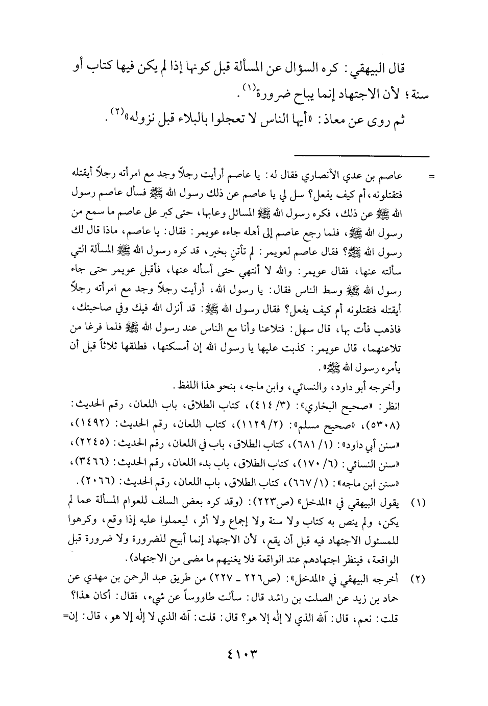 قَالَ الْبَيْهَقِيّ: كره السُّؤَال عَن الْمَسْأَلَة قبل كَونهَا إِذا لم يكن فِيهَا كتاب أَو سنة، لِأَن الِاجْتِهَاد إِنَّمَا يُبَاح ضَرُورَة.