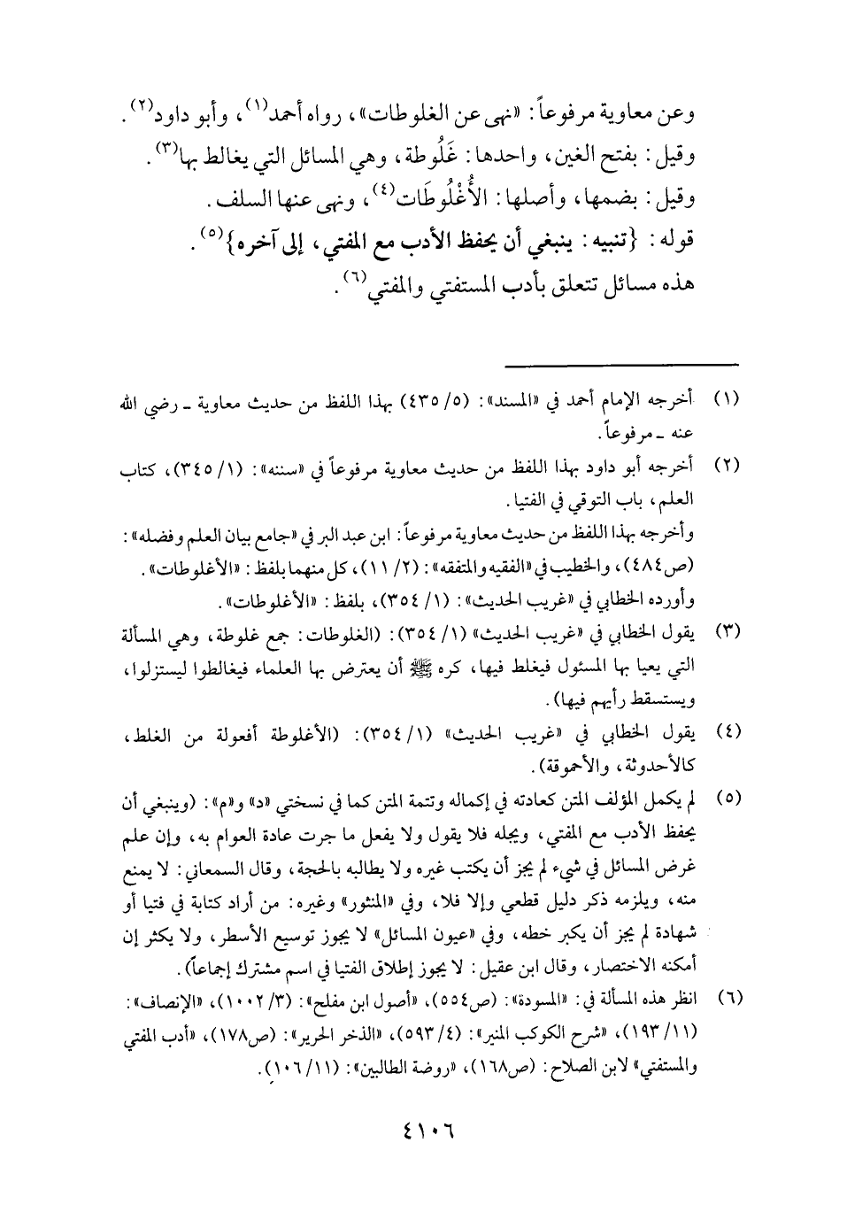 وَعَن مُعَاوِيَة مَرْفُوعا: " نهى عَن الغلوطات "، رَوَاهُ أَحْمد، وَأَبُو دَاوُد.