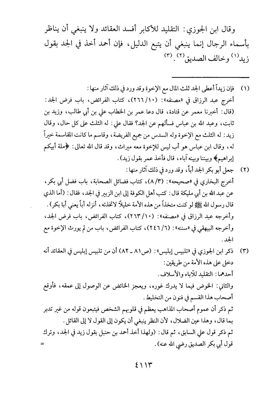 وَقَالَ ابْن الْجَوْزِيّ: التَّقْلِيد للأكابر أفسد العقائد وَلَا يَنْبَغِي أَن يناظر بأسماء الرِّجَال إِنَّمَا يَنْبَغِي أَن يتبع الدَّلِيل، فَإِن أَحْمد أَخذ فِي الْجد بقول زيد وَخَالف الصّديق.