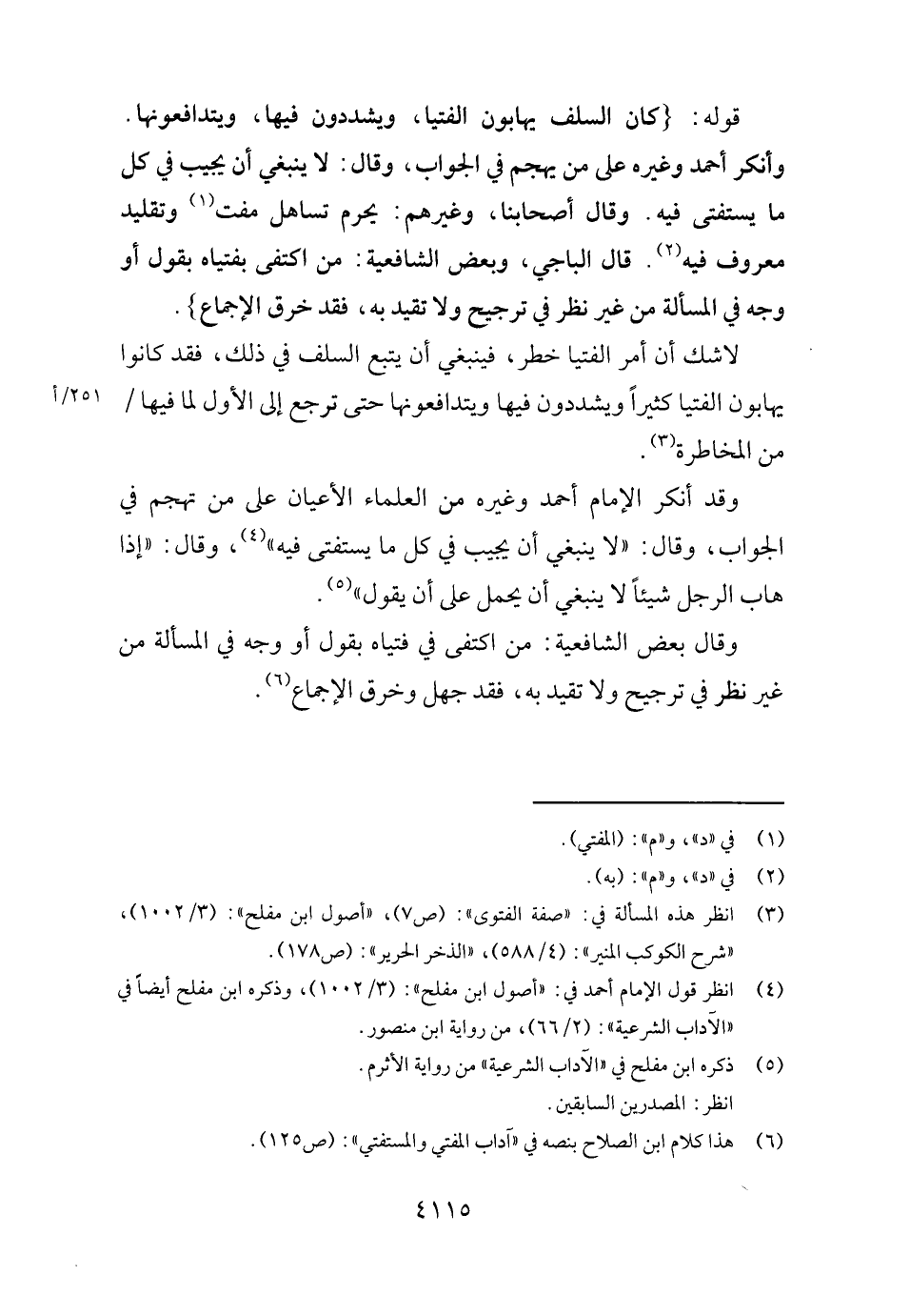 وَقد أنكر الإِمَام أَحْمد وَغَيره من الْعلمَاء الْأَعْيَان على من تهجم فِي الْجَواب، وَقَالَ: " لَا يَنْبَغِي أَن يُجيب فِي كل مَا يستفتى فِيهِ "، وَقَالَ: " إِذا هاب الرجل شَيْئا لَا يَنْبَغِي أَن يحمل على أَن يَقُول ".