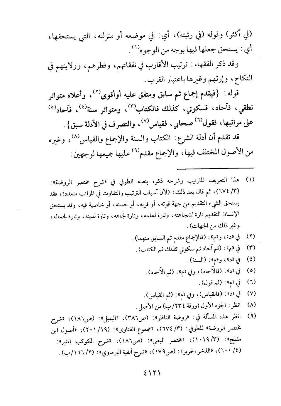 قَوْله: {فَيقدم إِجْمَاع ثمَّ سَابق ومتفق عَلَيْهِ أَو أقوى، وَأَعلاهُ متواتر نطقي، فآحاد، فسكوتي، كَذَلِك فالكتاب، ومتواتر سنة، فآحاد على مراتبها، فَقَوْل صَحَابِيّ، فَقِيَاس، وَالتَّصَرُّف فِي الْأَدِلَّة سبق} .