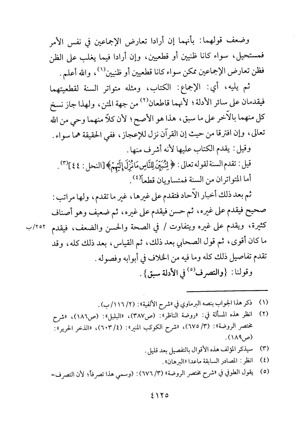 ثمَّ يَلِيهِ، أَي: الْإِجْمَاع: الْكتاب، وَمثله متواتر السّنة لقطعيتهما فيقدمان على سَائِر الْأَدِلَّة؛ لِأَنَّهُمَا قاطعان من جِهَة الْمَتْن، وَلِهَذَا جَازَ نسخ كل مِنْهُمَا بِالْآخرِ على مَا سبق، هَذَا هُوَ الْأَصَح؛ لِأَن كلا مِنْهُمَا وَحي من الله تَعَالَى، وَإِن افْتَرقَا من حَيْثُ إِن الْقُرْآن نزل للإعجاز، فَفِي الْحَقِيقَة هما سَوَاء.