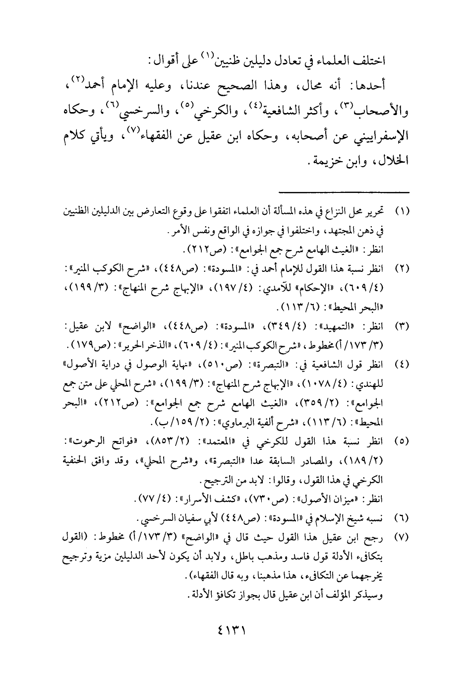 اخْتلف الْعلمَاء فِي تعادل دَلِيلين ظنيين على أَقْوَال:
