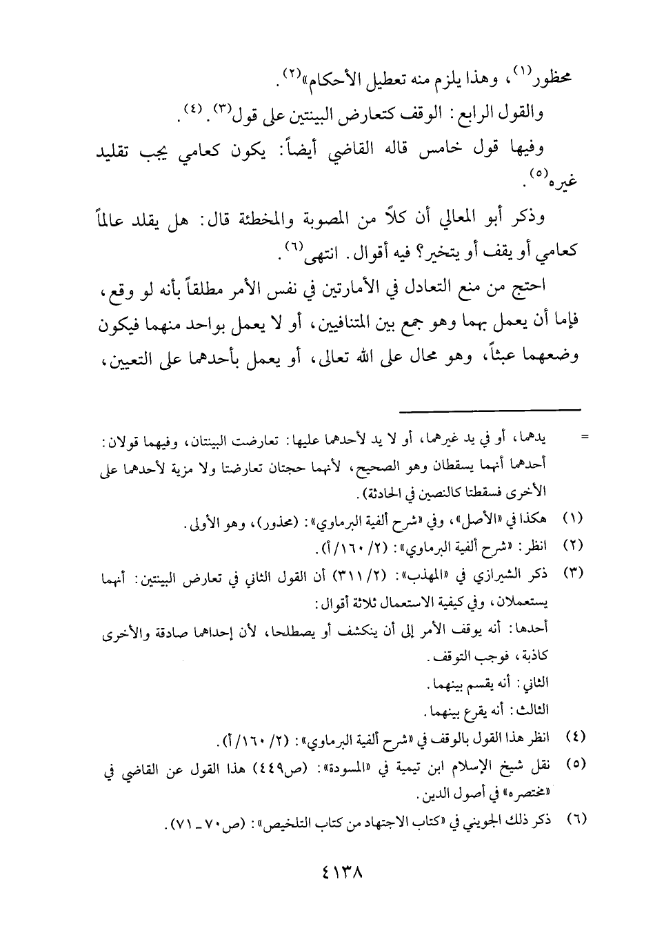 وَذكر أَبُو الْمَعَالِي أَن كلا من المصوبة والمخطئة قَالَ: هَل يُقَلّد عَالما كعامي أَو يقف أَو يتَخَيَّر؟ فِيهِ أَقْوَال. انْتهى.