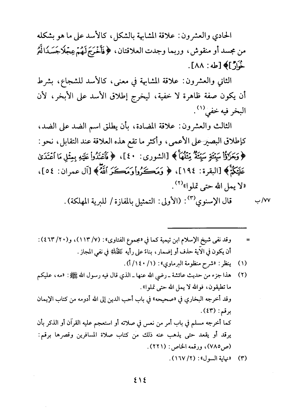 الْحَادِي وَالْعشْرُونَ: علاقَة المشابهة بالشكل، كالأسد على مَا هُوَ بشكله من مجسد أَو منقوش، وَرُبمَا وجدت العلاقتان، {فَأخْرج لَهُم عجلاً جسداً لَهُ خوار} [طه: ٨٨] .