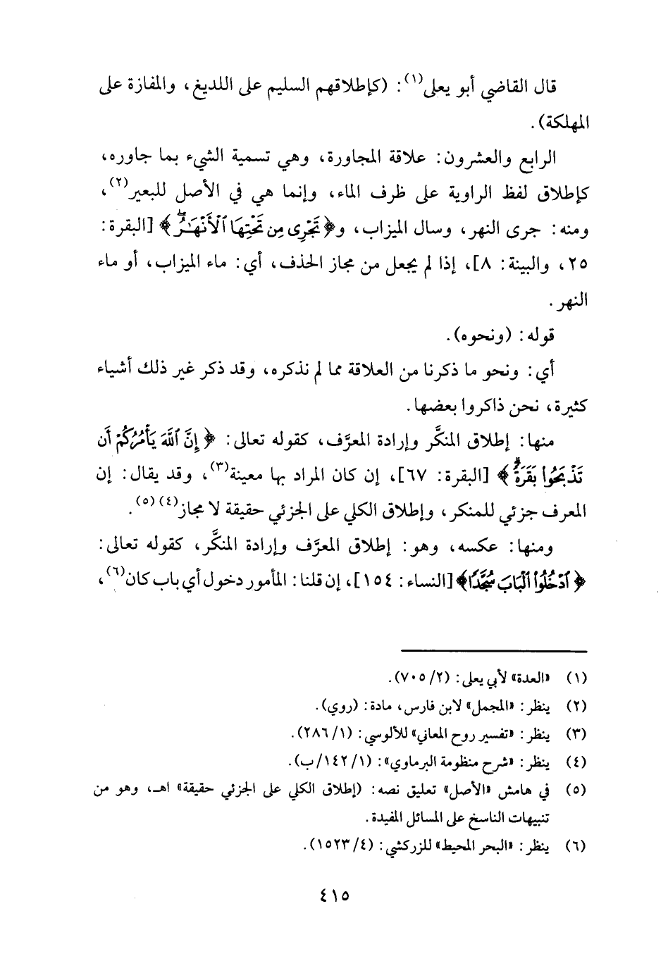 مِنْهَا: إِطْلَاق الْمُنكر وَإِرَادَة الْمُعَرّف، كَقَوْلِه تَعَالَى: {إِن الله يَأْمُركُمْ أَن تذبحوا بقرة} [الْبَقَرَة: ٦٧] ، إِن كَانَ المُرَاد بهَا مُعينَة، وَقد يُقَال: إِن الْمُعَرّف جزئي للْمُنكر، وَإِطْلَاق الْكُلِّي على الجزئي حَقِيقَة لَا مجَاز.