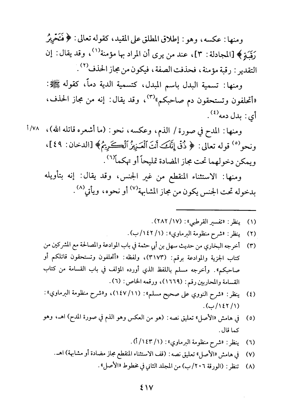 وَمِنْهَا: عَكسه، وَهُوَ: إِطْلَاق الْمُطلق على الْمُقَيد، كَقَوْلِه تَعَالَى: {فَتَحْرِير رَقَبَة} [المجادلة: ٣] ، عِنْد من يرى أَن المُرَاد بهَا مُؤمنَة، وَقد يُقَال: إِن التَّقْدِير: رَقَبَة مُؤمنَة، فحذفت الصّفة، فَيكون من مجَاز الْحَذف.
