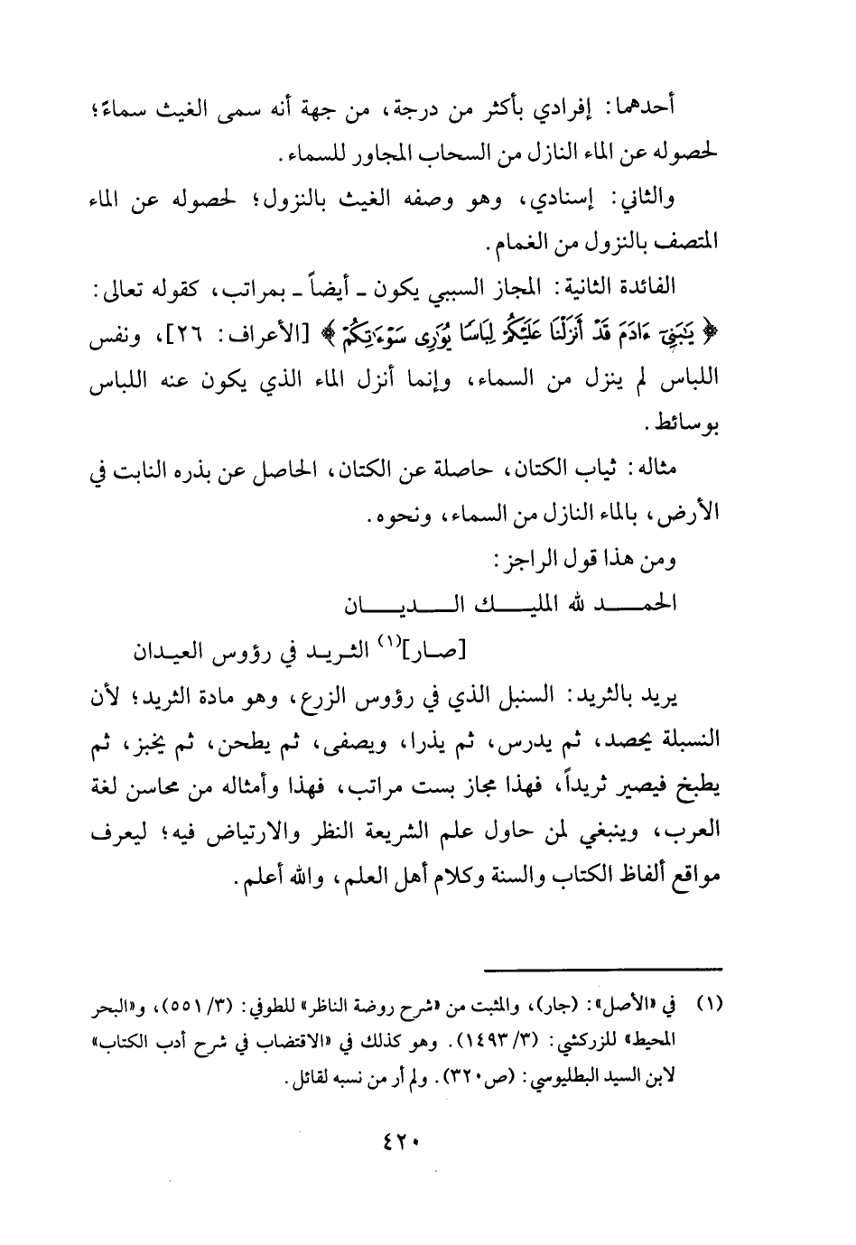 يُرِيد بالثريد: السنبل الَّذِي فِي رُؤُوس الزَّرْع، وَهُوَ مَادَّة الثَّرِيد؛ لِأَن النسبلة يحصد، ثمَّ يدرس، ثمَّ يذرا، ويصفى، ثمَّ يطحن، ثمَّ يخبز، ثمَّ يطْبخ فَيصير ثريداً، فَهَذَا مجَاز بست مَرَاتِب، فَهَذَا وَأَمْثَاله من محَاسِن لُغَة الْعَرَب، وَيَنْبَغِي لمن حاول علم الشَّرِيعَة النّظر والارتياض فِيهِ؛ ليعرف مواقع أَلْفَاظ الْكتاب وَالسّنة وَكَلَام أهل الْعلم، وَالله أعلم.