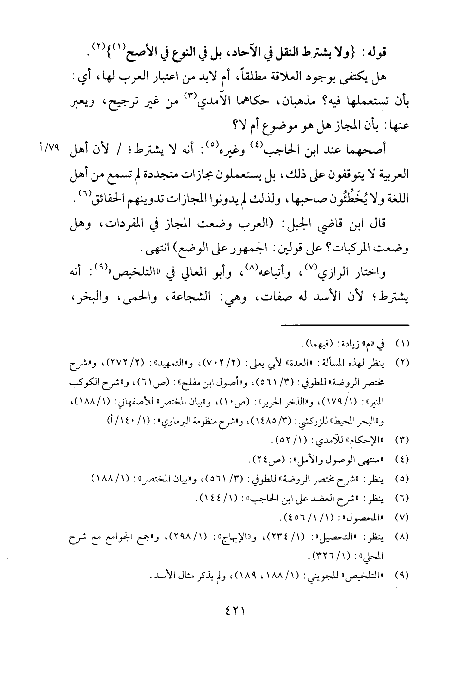 وَاخْتَارَ الرَّازِيّ، وَأَتْبَاعه، وَأَبُو الْمَعَالِي فِي " التَّلْخِيص ": أَنه يشْتَرط؛ لِأَن الْأسد لَهُ صِفَات، وَهِي: الشجَاعَة، والحمى، والبخر،