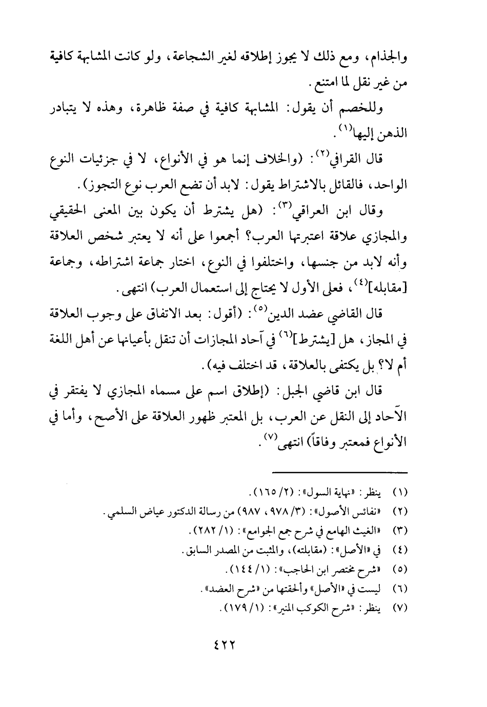 والجذام، وَمَعَ ذَلِك لَا يجوز إِطْلَاقه لغير الشجَاعَة، وَلَو كَانَت المشابهة كَافِيَة من غير نقل لما امْتنع.