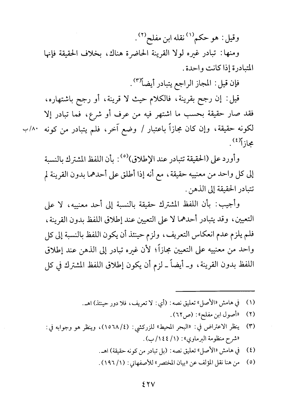 وَأورد على (الْحَقِيقَة تتبادر عِنْد الْإِطْلَاق) : بِأَن اللَّفْظ الْمُشْتَرك بِالنِّسْبَةِ إِلَى كل وَاحِد من معنييه حَقِيقَة، مَعَ أَنه إِذا أطلق على أَحدهمَا بِدُونِ الْقَرِينَة لم تتبادر الْحَقِيقَة إِلَى الذِّهْن.