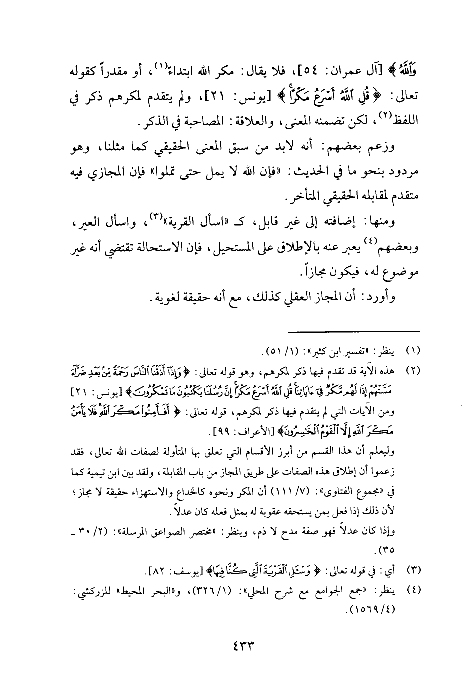 وَالله} [آل عمرَان: ٥٤] ، فَلَا يُقَال: مكر الله ابْتِدَاء، أَو مُقَدرا كَقَوْلِه تَعَالَى: {قل الله أسْرع مكراً} [يُونُس: ٢١] ، وَلم يتَقَدَّم لمكرهم ذكر فِي اللَّفْظ، لَكِن تضمنه الْمَعْنى، والعلاقة: المصاحبة فِي الذّكر.
