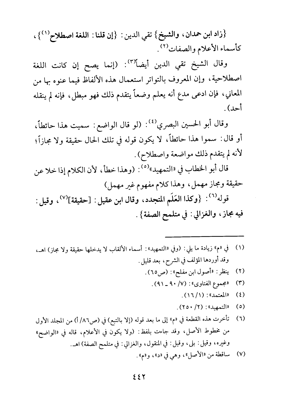 وَقَالَ الشَّيْخ تَقِيّ الدّين أَيْضا: (إِنَّمَا يَصح إِن كَانَت اللُّغَة اصطلاحية، وَإِن الْمَعْرُوف بالتواتر اسْتِعْمَال هَذِه الْأَلْفَاظ فِيمَا عنوه بهَا من الْمعَانِي، فَإِن ادّعى مُدع أَنه يعلم وضعا يتَقَدَّم ذَلِك فَهُوَ مُبْطل، فَإِنَّهُ لم يَنْقُلهُ أحد) .