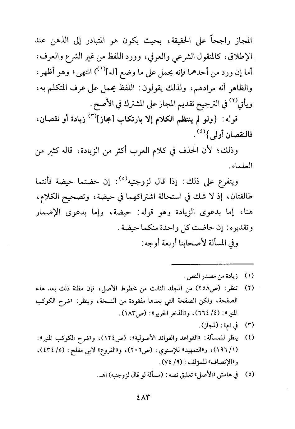 قَوْله: {وَلَو لم يَنْتَظِم الْكَلَام إِلَّا بارتكاب [مجَاز] زِيَادَة أَو نُقْصَان، فالنقصان أولى} .