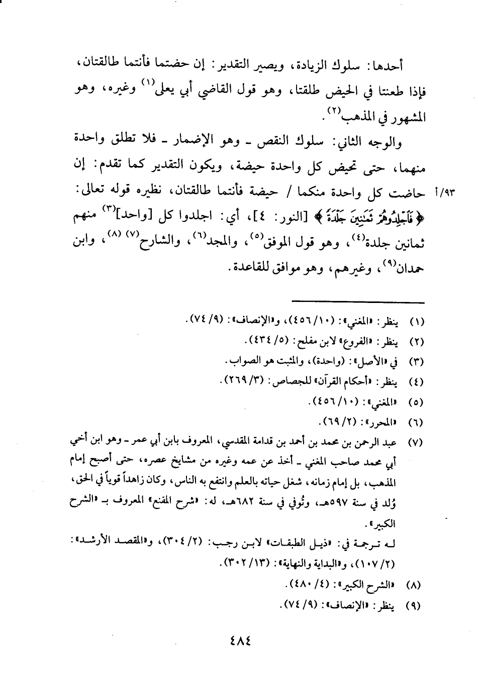 وَالْوَجْه الثَّانِي: سلوك النَّقْص - وَهُوَ الْإِضْمَار - فَلَا تطلق وَاحِدَة مِنْهُمَا، حَتَّى تحيض كل وَاحِدَة حَيْضَة، وَيكون التَّقْدِير كَمَا تقدم: إِن حَاضَت كل وَاحِدَة مِنْكُمَا / حَيْضَة فأنتما طالقتان نَظِيره قَوْله تَعَالَى: {فَاجْلِدُوهُمْ ثَمَانِينَ جلدَة} [النُّور: ٤] ، أَي: اجلدوا كل [وَاحِد] مِنْهُم ثَمَانِينَ جلدَة، وَهُوَ قَول الْمُوفق، وَالْمجد، وَالشَّارِح، وَابْن حمدَان، وَغَيرهم، وَهُوَ مُوَافق للقاعدة.