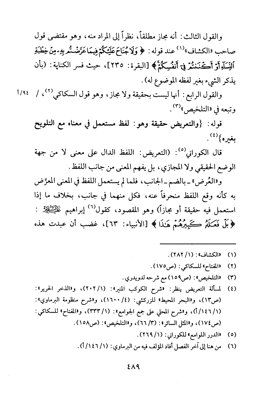 و" الْعرض " بِالضَّمِّ - الْجَانِب، فَلَمَّا لم يسْتَعْمل اللَّفْظ فِي الْمَعْنى المعرض بِهِ كَأَنَّهُ وَقع اللَّفْظ منحرفاً عَنهُ، فَكل مِنْهُمَا فِي جَانب، بِخِلَاف مَا إِذا اسْتعْمل فِيهِ حَقِيقَة أَو مجَازًا) وَهُوَ الْمَقْصُود، كَقَوْل إِبْرَاهِيم عَلَيْهِ السَّلَام: {بل فعله كَبِيرهمْ هَذَا} [الْأَنْبِيَاء: ٦٣] ، غضب أَن عبدت هَذِه