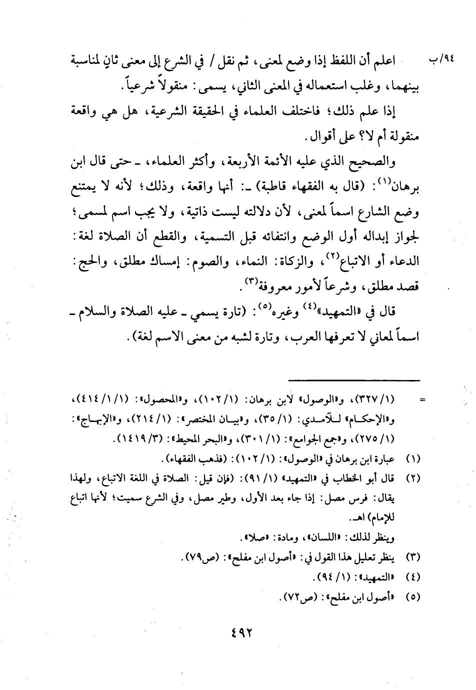 اعْلَم أَن اللَّفْظ إِذا وضع لِمَعْنى، ثمَّ نقل / فِي الشَّرْع إِلَى معنى ثَان لمناسبة بَينهمَا، وَغلب اسْتِعْمَاله فِي الْمَعْنى الثَّانِي، يُسمى: مَنْقُولًا شَرْعِيًّا.