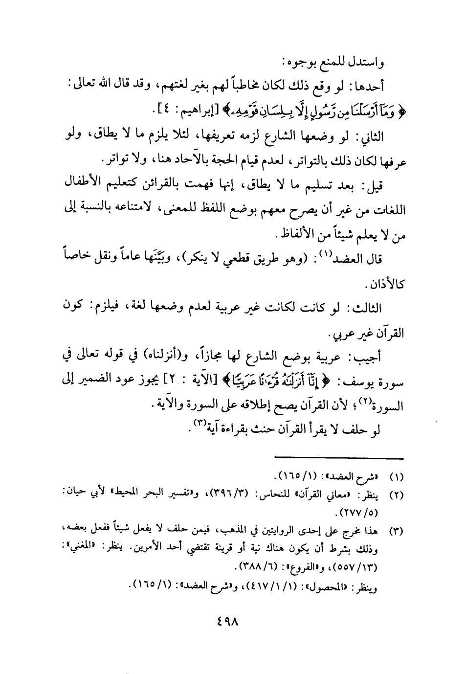 أُجِيب: عَرَبِيَّة بِوَضْع الشَّارِع لَهَا مجَازًا، و (أَنزَلْنَاهُ) فِي قَوْله تَعَالَى فِي سُورَة يُوسُف: {إِنَّا أَنزَلْنَاهُ قرءاناً عَرَبيا} [الْآيَة: ٢] يجوز عود الضَّمِير إِلَى السُّورَة، لِأَن الْقُرْآن يَصح إِطْلَاقه على السُّورَة وَالْآيَة. لَو حلف لَا يقْرَأ الْقُرْآن حنث بِقِرَاءَة آيَة.