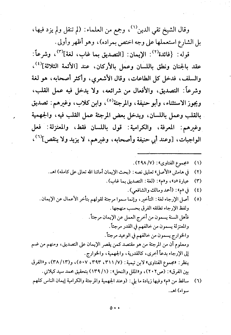 قَوْله: {فَائِدَة: الْإِيمَان: [التَّصْدِيق بِمَا غَابَ، لُغَة] ، وَشرعا: عقد بالجنان ونطق بِاللِّسَانِ وَعمل بالأركان، عِنْد [الْأَئِمَّة الثَّلَاثَة] ، وَالسَّلَف، فَدخل كل الطَّاعَات، وَقَالَ الْأَشْعَرِيّ، وَأكْثر أَصْحَابه، وَهُوَ لُغَة وَشرعا: التَّصْدِيق، وَالْأَفْعَال من شرائعه، وَلَا يدْخل فِيهِ عمل الْقلب، وَيجوز الِاسْتِثْنَاء، وَأَبُو حنيفَة، والمرجئة، وَابْن كلاب، وَغَيرهم: تَصْدِيق بِالْقَلْبِ وَعمل بِاللِّسَانِ، وَيدخل بعض المرجئة عمل الْقلب فِيهِ، والجهمية وَغَيرهم: الْمعرفَة، والكرامية، قَول بِاللِّسَانِ فَقَط، والمعتزلة: فعل الْوَاجِبَات، [وَعند أبي حنيفَة وَأَصْحَابه، وَغَيرهم، لَا يزِيد وَلَا ينقص] ،