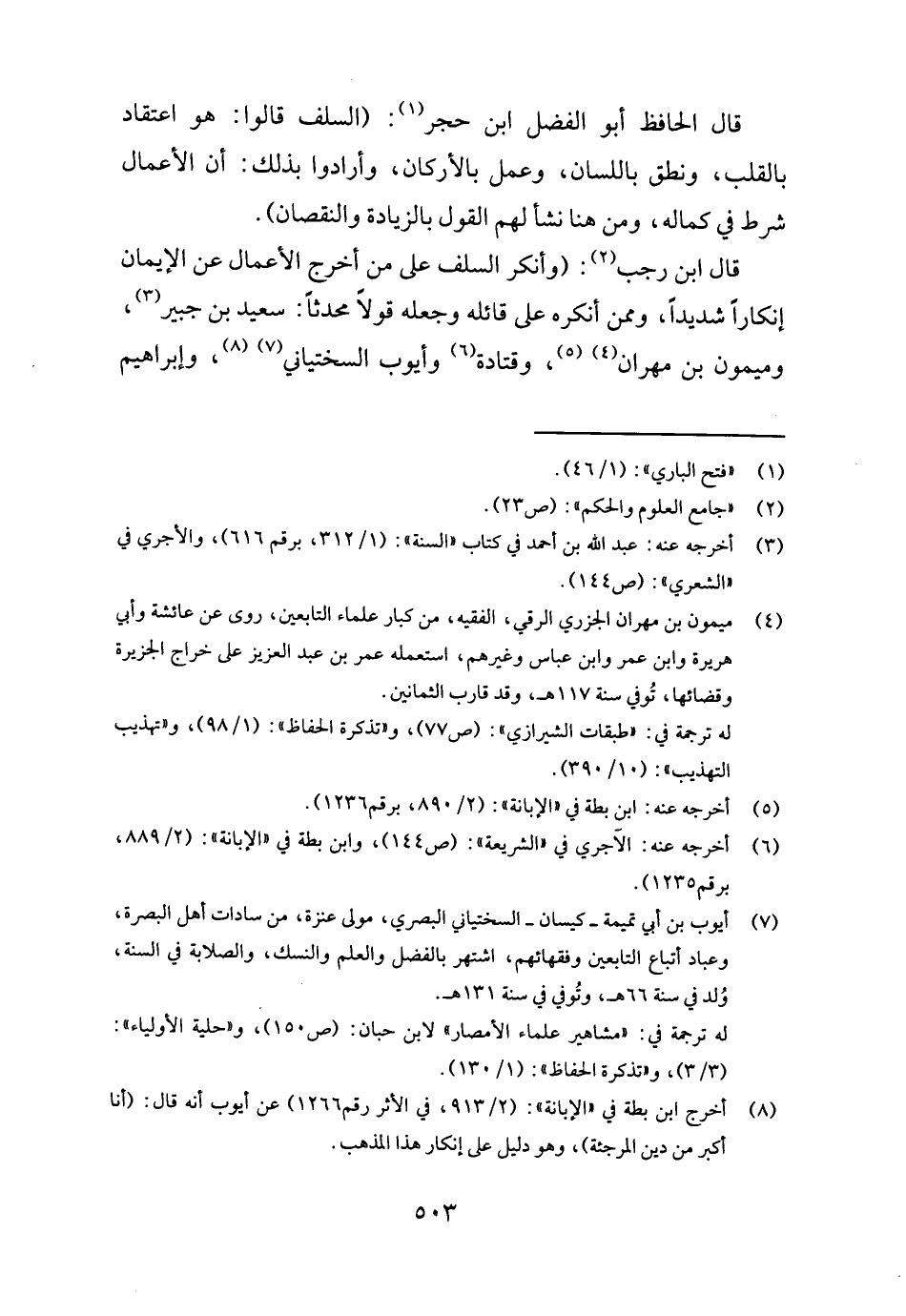 قَالَ ابْن رَجَب: (وَأنكر السّلف على من أخرج الْأَعْمَال عَن الْإِيمَان إنكاراً شَدِيدا، وَمِمَّنْ أنكرهُ على قَائِله وَجعله قولا مُحدثا: سعيد بن جُبَير، وَمَيْمُون بن مهْرَان، وَقَتَادَة وَأَيوب السّخْتِيَانِيّ، وَإِبْرَاهِيم