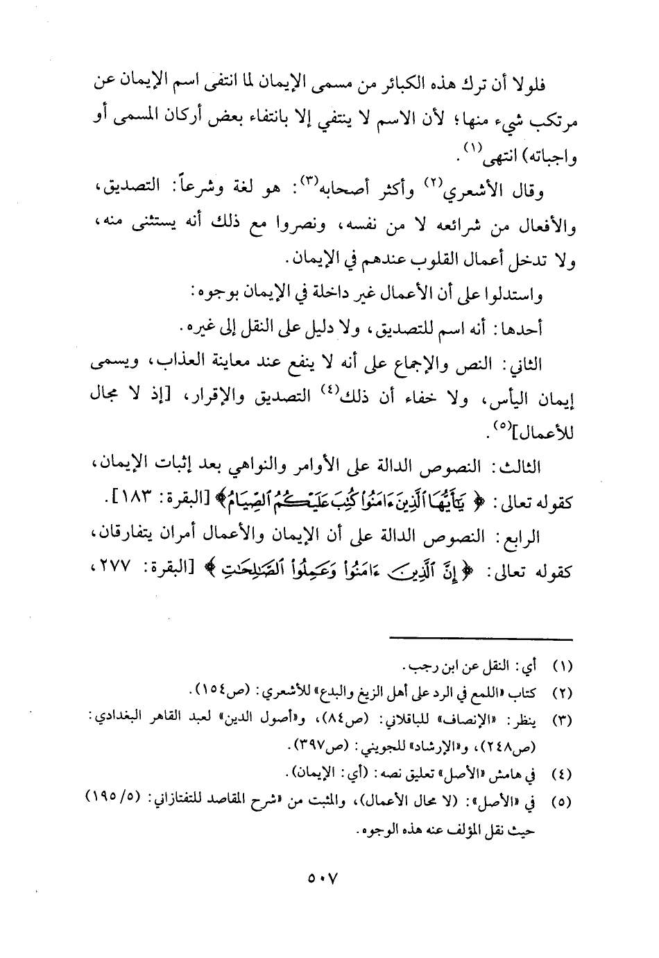 الرَّابِع: النُّصُوص الدَّالَّة على أَن الْإِيمَان والأعمال أَمْرَانِ يتفارقان، كَقَوْلِه تَعَالَى: {إِن الَّذين آمنُوا وَعمِلُوا الصَّالِحَات} [الْبَقَرَة: ٢٧٧،