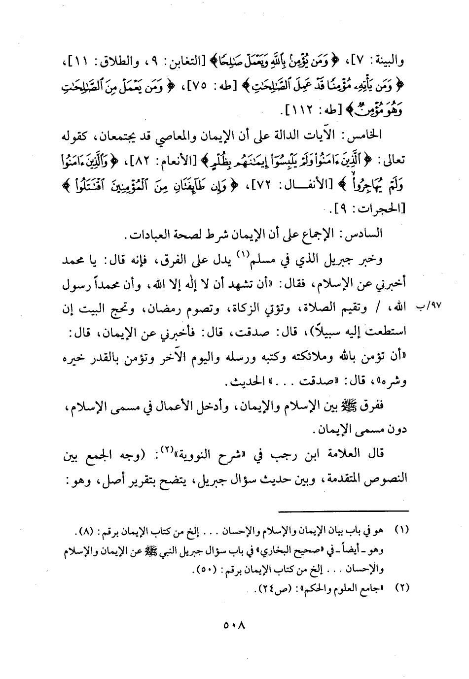 قَالَ الْعَلامَة ابْن رَجَب فِي " شرح النووية ": (وَجه الْجمع بَين النُّصُوص الْمُتَقَدّمَة، وَبَين حَدِيث سُؤال جِبْرِيل، يَتَّضِح بتقرير أصل، وَهُوَ: