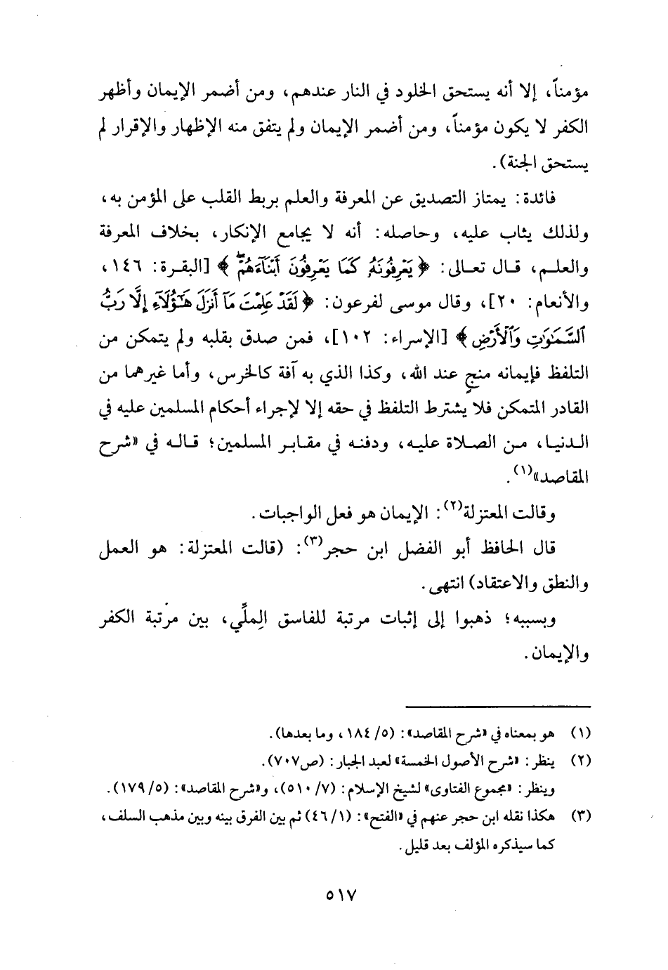 قَالَ الْحَافِظ أَبُو الْفضل ابْن حجر: (قَالَت الْمُعْتَزلَة: هُوَ الْعَمَل والنطق والاعتقاد) انْتهى.