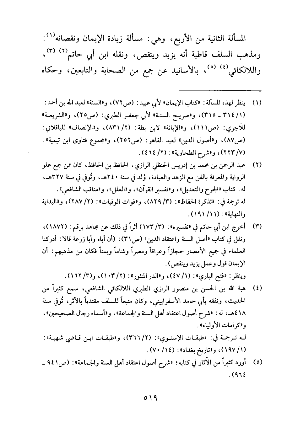 الْمَسْأَلَة الثَّانِيَة من الْأَرْبَع، وَهِي: مَسْأَلَة زِيَادَة الْإِيمَان ونقصانه: وَمذهب السّلف قاطبة أَنه يزِيد وَينْقص، وَنَقله ابْن أبي حَاتِم، واللالكائي، بِالْأَسَانِيدِ عَن جمع من الصَّحَابَة وَالتَّابِعِينَ، وَحَكَاهُ