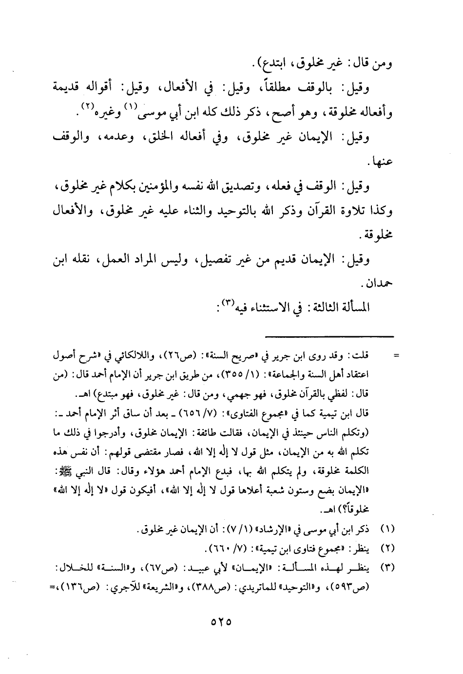 وَقيل: الْإِيمَان غير مَخْلُوق، وَفِي أَفعاله الْخلق، وَعَدَمه، وَالْوَقْف عَنْهَا.