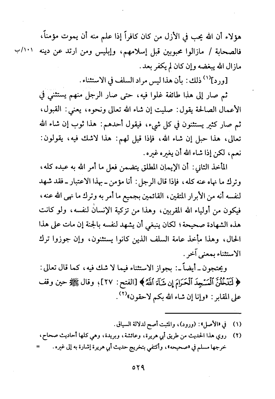 [ورد] ذَلِك: بِأَن هَذَا لَيْسَ مُرَاد السّلف فِي الِاسْتِثْنَاء.
