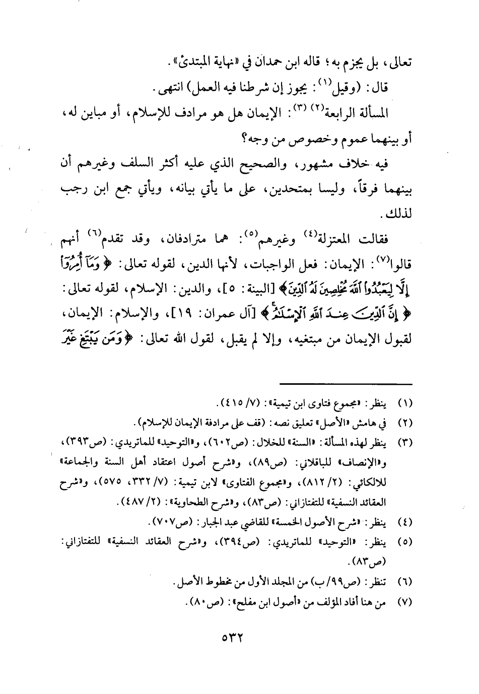 الْمَسْأَلَة الرَّابِعَة: الْإِيمَان هَل هُوَ مرادف لِلْإِسْلَامِ، أَو مباين لَهُ، أَو بَينهمَا عُمُوم وخصوص من وَجه؟