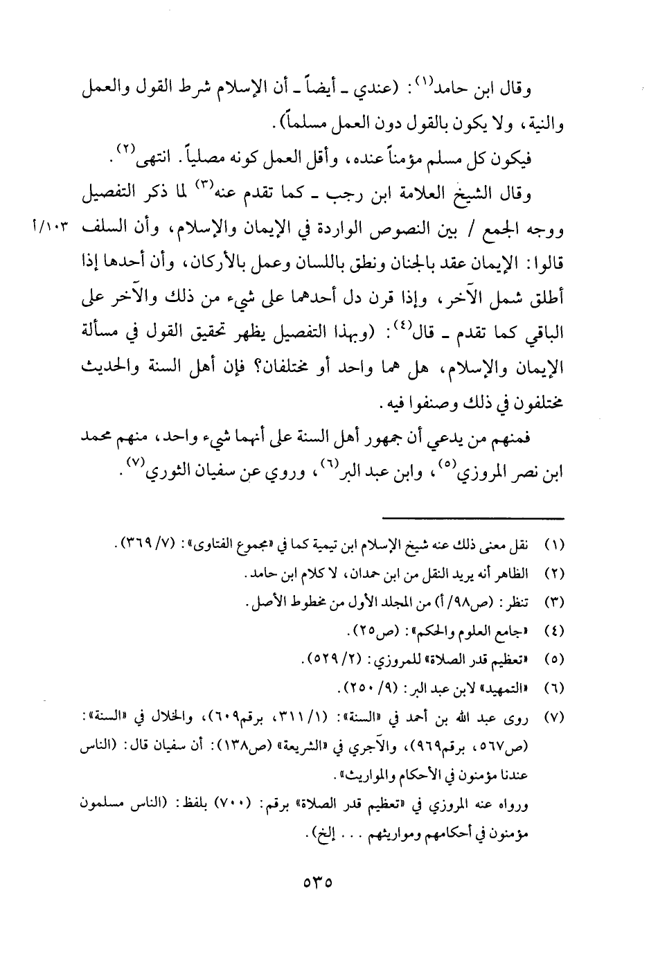 وَقَالَ ابْن حَامِد: (عِنْدِي أَيْضا أَن الْإِسْلَام شَرط القَوْل وَالْعَمَل وَالنِّيَّة، وَلَا يكون بالْقَوْل دون الْعَمَل مُسلما) .