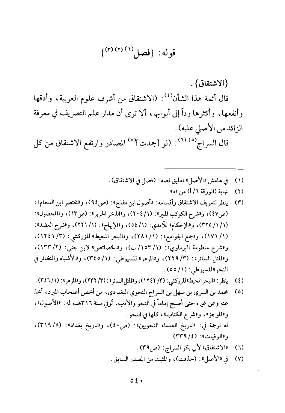 قَالَ أَئِمَّة هَذَا الشَّأْن: (الِاشْتِقَاق من أشرف عُلُوم الْعَرَبيَّة، وأدقها وأنفعها، وأكثرها ردا إِلَى أَبْوَابهَا، أَلا ترى أَن مدَار علم التصريف فِي معرفَة الزَّائِد من الْأَصْلِيّ عَلَيْهِ) .