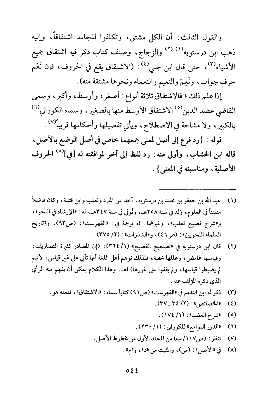 وَالْقَوْل الثَّالِث: أَن الْكل مُشْتَقّ، وتكلفوا للجامد اشتقاقاً، وَإِلَيْهِ ذهب ابْن درسْتوَيْه والزجاج، وصنف كتاب ذكر فِيهِ اشتقاق جَمِيع الْأَشْيَاء، حَتَّى قَالَ ابْن جني: (الِاشْتِقَاق يَقع فِي الْحُرُوف، فَإِن نعم حرف جَوَاب، وَنعم وَالنَّعِيم والنعماء وَنَحْوهَا مُشْتَقَّة مِنْهُ) .