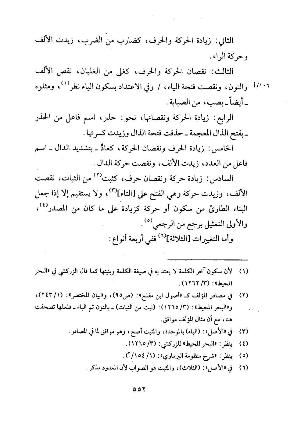 السَّادِس: زِيَادَة حَرَكَة ونقصان حرف، كثبت من الثَّبَات، نقصت الْألف، وزيدت حَرَكَة وَهِي الْفَتْح على [التَّاء] ، وَلَا يَسْتَقِيم إِلَّا إِذا جعل الْبناء الطَّارِئ من سُكُون أَو حَرَكَة كزيادة على مَا كَانَ من الْمصدر، وَالْأولَى التَّمْثِيل برجع من الرَّجْعِيّ.