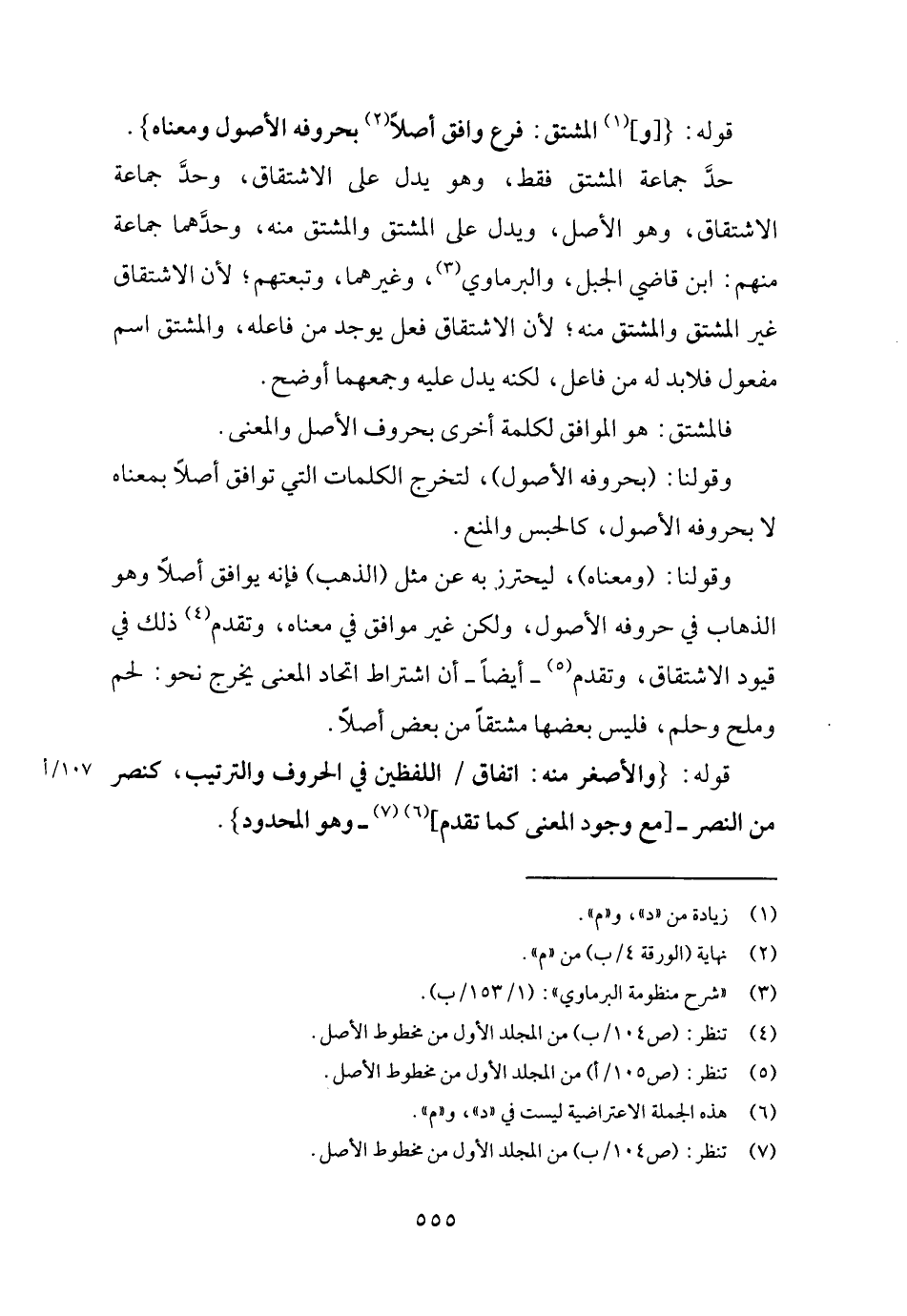 قَوْله: { [و] الْمُشْتَقّ: فرع وَافق أصلا بِحُرُوفِهِ الْأُصُول وَمَعْنَاهُ} .