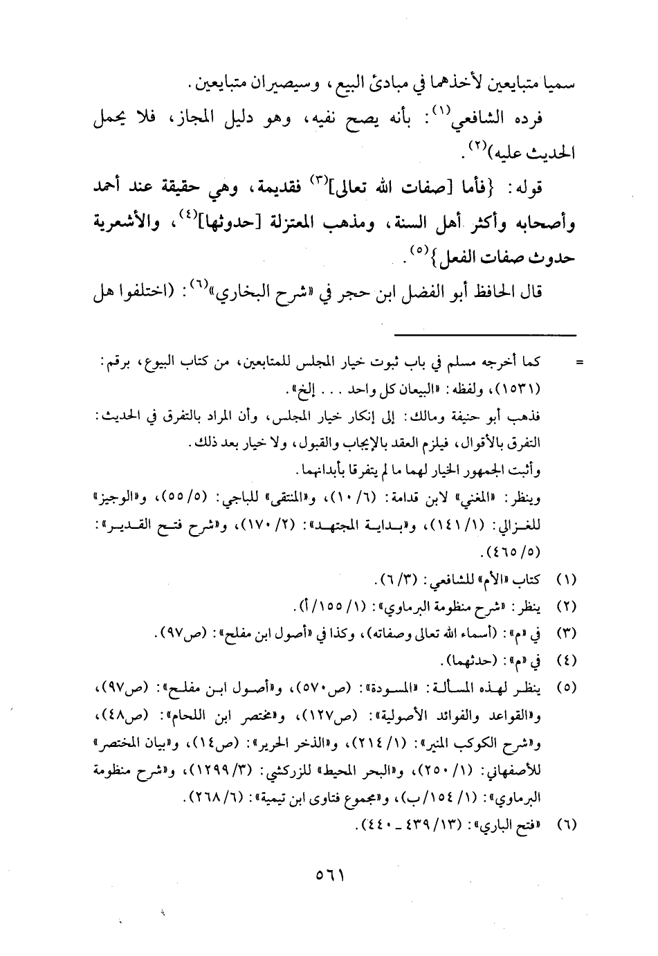 قَوْله: {فَأَما [صِفَات الله تَعَالَى] فقديمة، وَهِي حَقِيقَة عِنْد أَحْمد وَأَصْحَابه وَأكْثر أهل السّنة، وَمذهب الْمُعْتَزلَة [حدوثها] ، والأشعرية حُدُوث صِفَات الْفِعْل} .