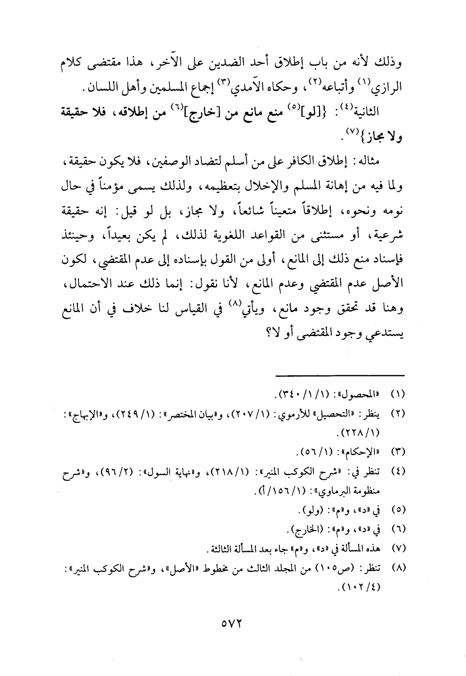 مِثَاله: إِطْلَاق الْكَافِر على من أسلم لتضاد الوصفين، فَلَا يكون حَقِيقَة، وَلما فِيهِ من إهانة الْمُسلم والإخلال بتعظيمه، وَلذَلِك يُسمى مُؤمنا فِي حَال نَومه وَنَحْوه، إطلاقاً مُتَعَيّنا شَائِعا، وَلَا مجَاز، بل لَو قيل: إِنَّه حَقِيقَة شَرْعِيَّة، أَو مُسْتَثْنى من الْقَوَاعِد اللُّغَوِيَّة لذَلِك، لم يكن بَعيدا، وَحِينَئِذٍ فإسناد منع ذَلِك إِلَى الْمَانِع، أولى من القَوْل بِإِسْنَادِهِ إِلَى عدم الْمُقْتَضِي، لكَون الأَصْل عدم الْمُقْتَضِي وَعدم الْمَانِع، لأَنا نقُول: إِنَّمَا ذَلِك عِنْد الِاحْتِمَال، وَهنا قد تحقق وجود مَانع، وَيَأْتِي فِي الْقيَاس لنا خلاف فِي أَن الْمَانِع يَسْتَدْعِي وجود الْمُقْتَضى أَو لَا؟