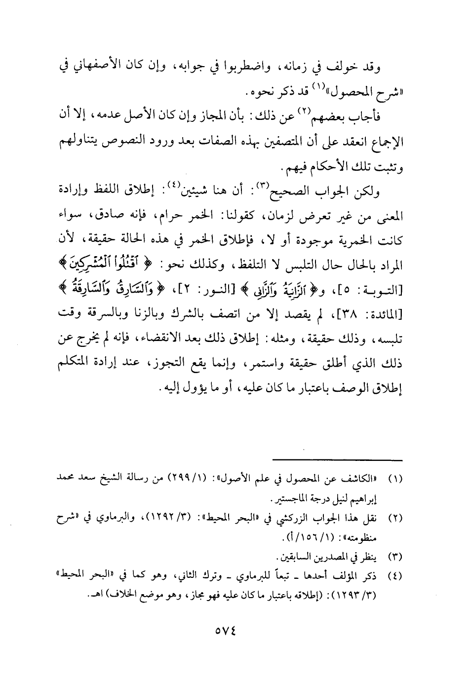 وَلَكِن الْجَواب الصَّحِيح: أَن هُنَا شَيْئَيْنِ: إِطْلَاق اللَّفْظ وَإِرَادَة الْمَعْنى من غير تعرض لزمان، كَقَوْلِنَا: الْخمر حرَام، فَإِنَّهُ صَادِق، سَوَاء كَانَت الخمرية مَوْجُودَة أَو لَا، فإطلاق الْخمر فِي هَذِه الْحَالة حَقِيقَة، لِأَن المُرَاد بِالْحَال حَال التَّلَبُّس لَا التَّلَفُّظ، وَكَذَلِكَ نَحْو: {اقْتُلُوا الْمُشْركين} [التَّوْبَة: ٥] ، و {الزَّانِيَة وَالزَّانِي} [النُّور: ٢] ، {وَالسَّارِق والسارقة} [الْمَائِدَة: ٣٨] ، لم يقْصد إِلَّا من اتّصف بالشرك وبالزنا، وبالسرقة وَقت تلبسه، وَذَلِكَ حَقِيقَة، وَمثله: إِطْلَاق ذَلِك بعد الِانْقِضَاء، فَإِنَّهُ لم يخرج عَن ذَلِك الَّذِي أطلق حَقِيقَة وَاسْتمرّ، وَإِنَّمَا يَقع التَّجَوُّز، عِنْد إِرَادَة الْمُتَكَلّم إِطْلَاق الْوَصْف بِاعْتِبَار مَا كَانَ عَلَيْهِ، أَو مَا يؤول إِلَيْهِ.
