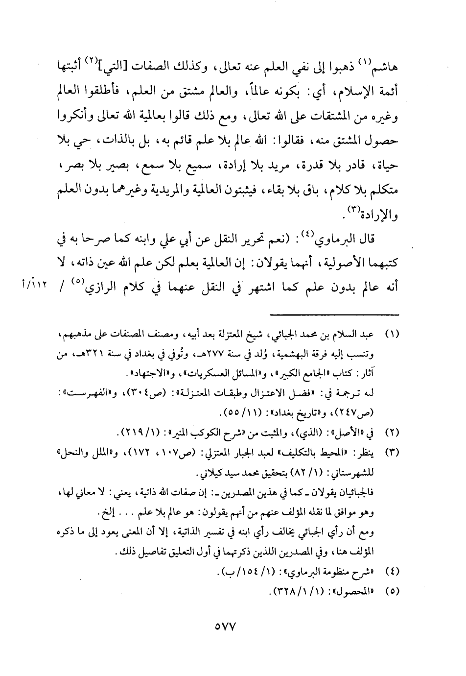هَاشم ذَهَبُوا إِلَى نفي الْعلم عَنهُ تَعَالَى، وَكَذَلِكَ الصِّفَات [الَّتِي] أثبتها أَئِمَّة الْإِسْلَام، أَي: بِكَوْنِهِ عَالما، والعالم مُشْتَقّ من الْعلم، فأطلقوا الْعَالم وَغَيره من المشتقات على الله تَعَالَى، وَمَعَ ذَلِك قَالُوا بعالمية الله تَعَالَى وأنكروا حُصُول الْمُشْتَقّ مِنْهُ، فَقَالُوا: الله عَالم بِلَا علم قَائِم بِهِ، بل بِالذَّاتِ، حَيّ بِلَا حَيَاة، قَادر بِلَا قدرَة، مُرِيد بِلَا إِرَادَة، سميع بِلَا سمع، بَصِير بِلَا بصر، مُتَكَلم بِلَا كَلَام، بَاقٍ بِلَا بَقَاء، فيثبتون العالمية والمريدية وَغَيرهمَا بِدُونِ الْعلم والإرادة.
