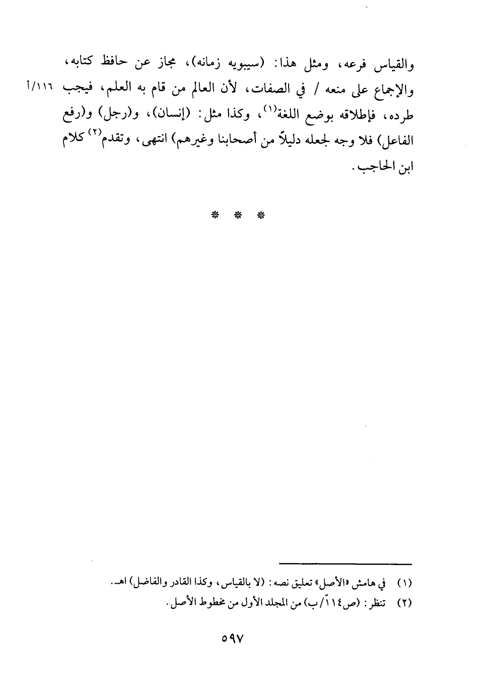 وَالْقِيَاس فَرعه، وَمثل هَذَا: (سِيبَوَيْهٍ زَمَانه) ، مجَاز عَن حَافظ كِتَابه، وَالْإِجْمَاع على مَنعه / فِي الصِّفَات، لِأَن الْعَالم من قَامَ بِهِ الْعلم، فَيجب طرده، فإطلاقه بِوَضْع اللُّغَة، وَكَذَا مثل: (إِنْسَان) ، و (رجل) و (رفع الْفَاعِل) فَلَا وَجه لجعله دَلِيلا من أَصْحَابنَا وَغَيرهم) انْتهى، وَتقدم كَلَام ابْن الْحَاجِب.