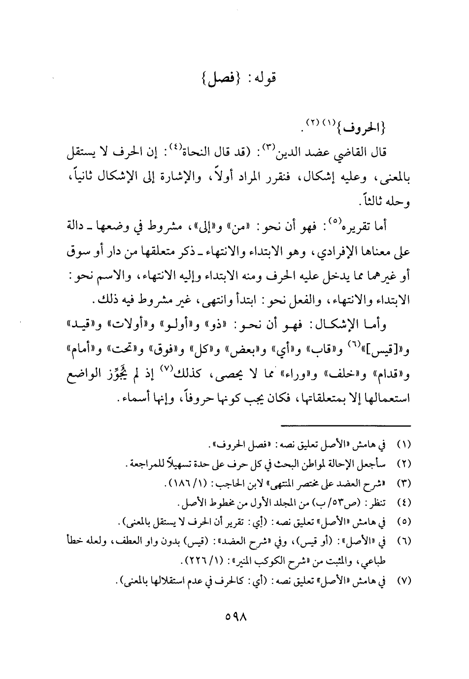 قَالَ القَاضِي عضد الدّين: (قد قَالَ النُّحَاة: إِن الْحَرْف لَا يسْتَقلّ بِالْمَعْنَى، وَعَلِيهِ إِشْكَال، فنقرر المُرَاد أَولا، وَالْإِشَارَة إِلَى الْإِشْكَال ثَانِيًا، وحله ثَالِثا.
