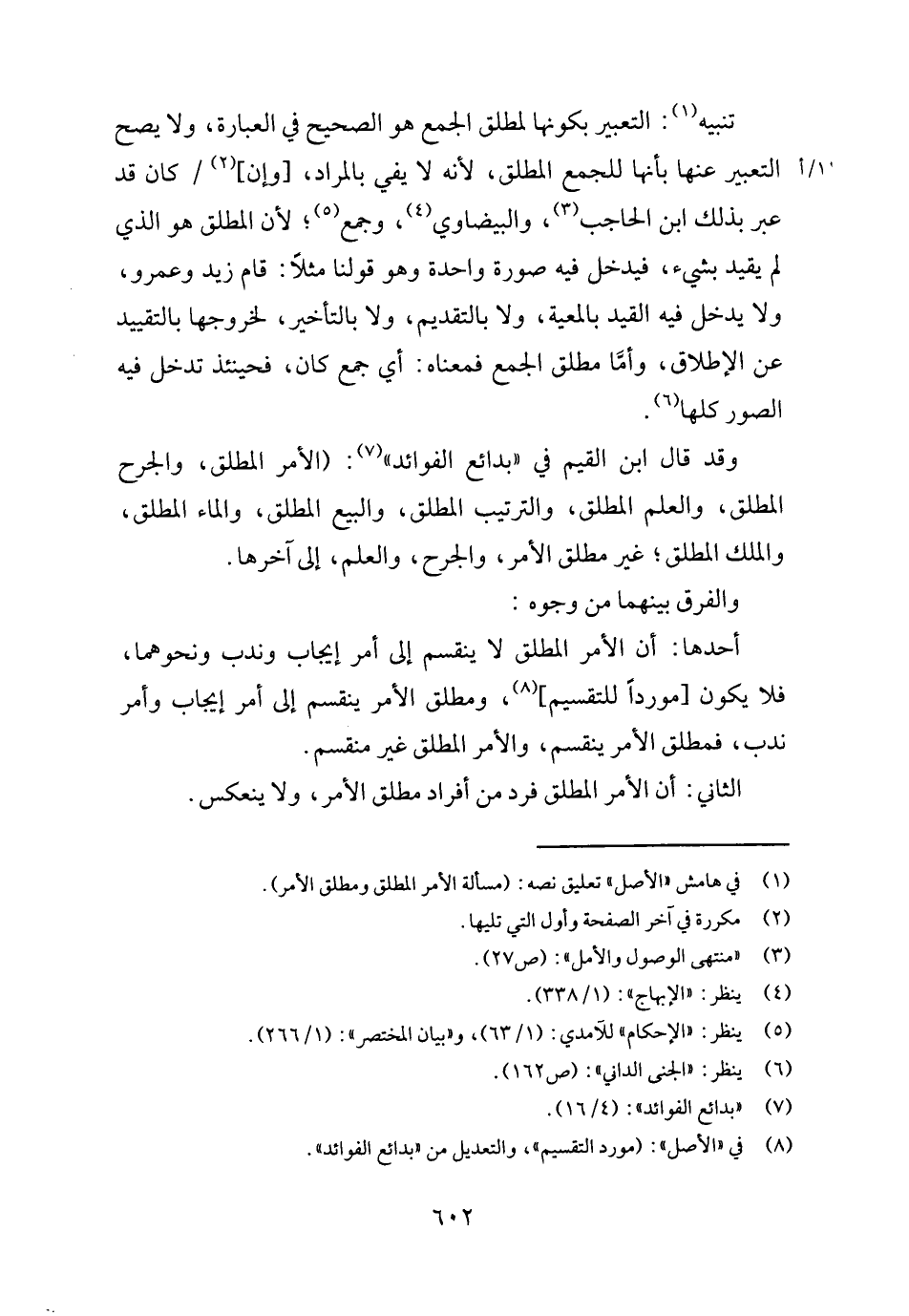 وَقد قَالَ ابْن الْقيم فِي " بَدَائِع الْفَوَائِد ": (الْأَمر الْمُطلق، وَالْجرْح الْمُطلق، وَالْعلم الْمُطلق، وَالتَّرْتِيب الْمُطلق، وَالْبيع الْمُطلق، وَالْمَاء الْمُطلق، وَالْملك الْمُطلق؛ غير مُطلق الْأَمر، وَالْجرْح، وَالْعلم، إِلَى آخرهَا.